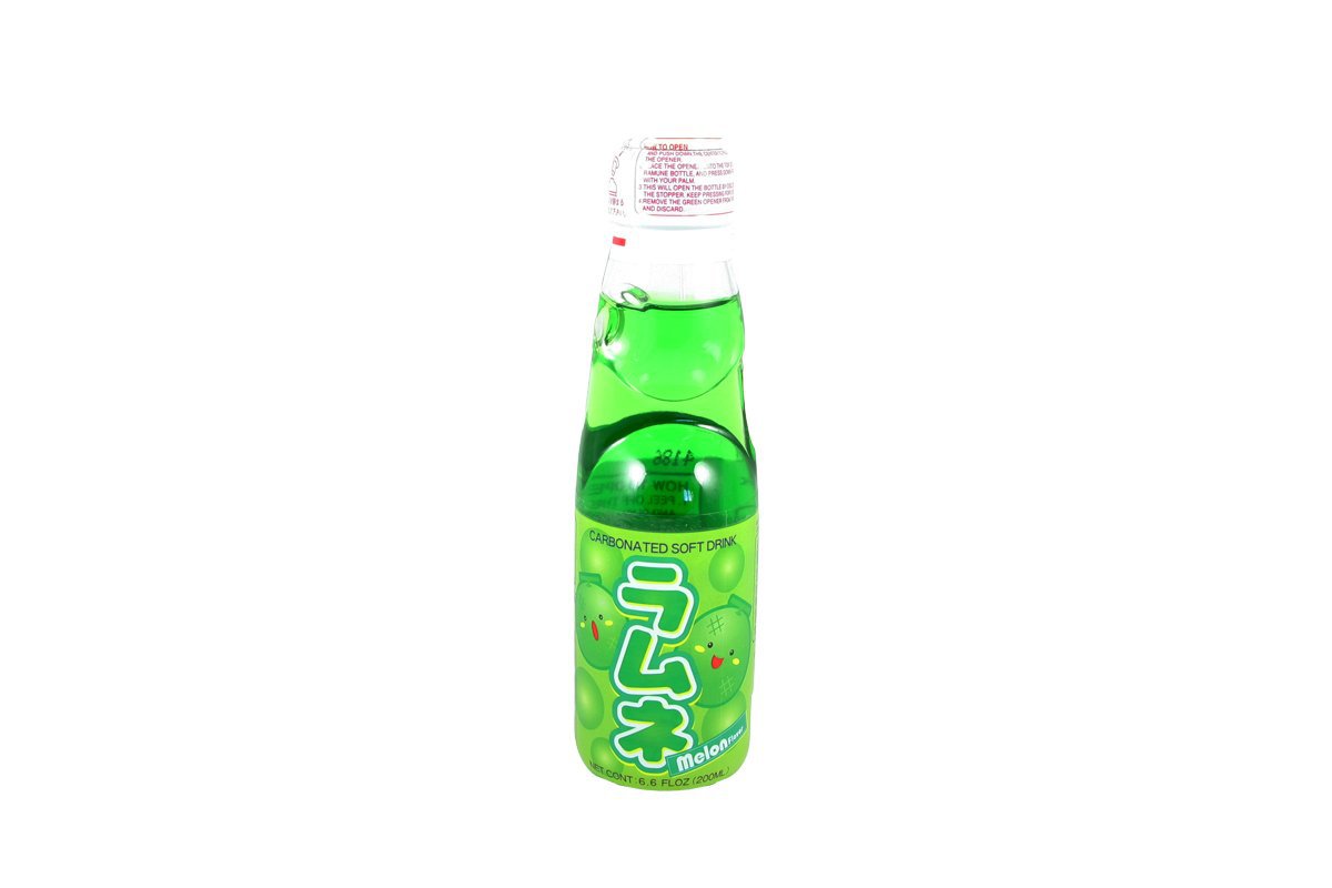 Conception unique pour les limonades Japonaises Ramune, le « soda Japonais » avec des fines bulles et des saveurs originales et très rafraîchissantes comme cette limonade ramune goût melon à boire impérativement fraîche.